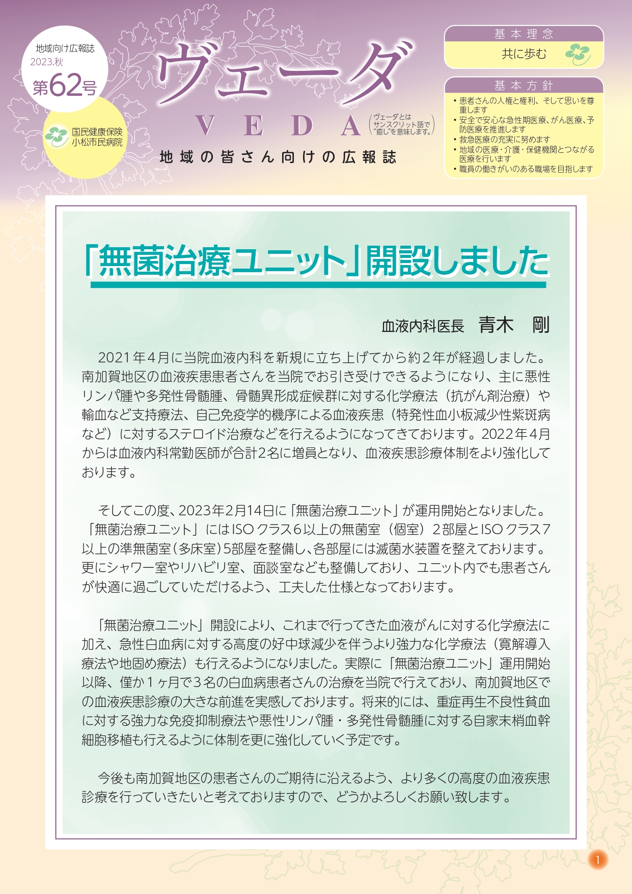 小松市民病院では現在行われている治療や医療制度、小松市民病院の現在の姿や目指しているものなどについて、少しでも地域の方々に理解していただくためにこの広報誌「ヴェーダ」を発行しています。