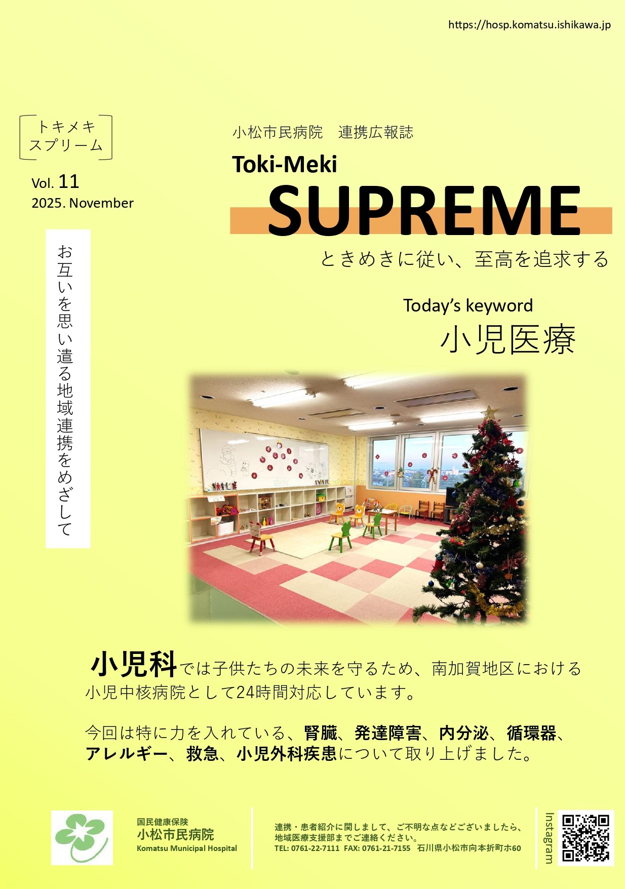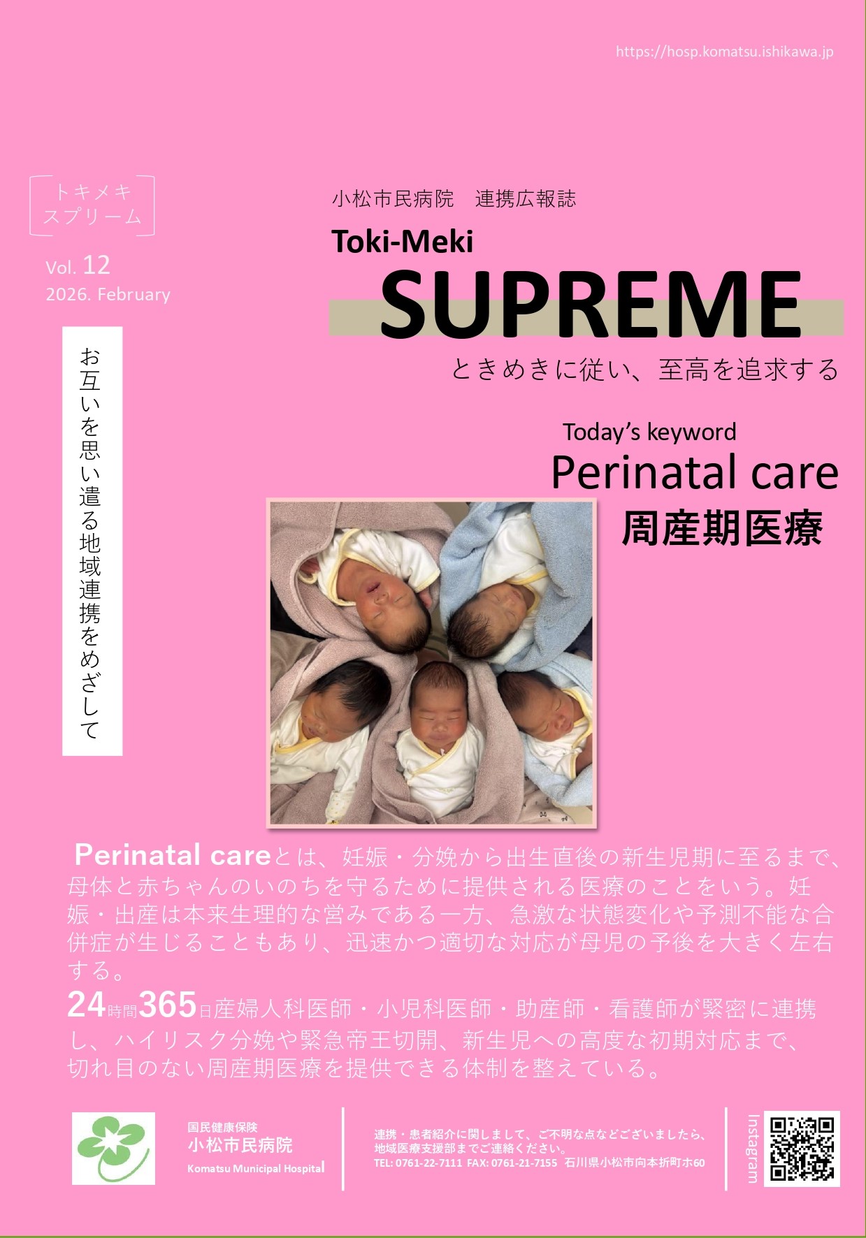 連携広報誌 Toki-Meki SUPREMEについて 地域の医療機関の皆様に向けて、当院の文化や風土、現在の取り組みや将来の方向性についてもっともっと知っていただくために作成した連携広報誌です。 名前の由来について Toki-Meki:診療の中で心動かされることや、心が従うことは何か。 SUPREME:目指す高みや乗り越えていくべき壁は何か。 毎回テーマを決めて我々からのメッセージを送ります。 一覧 Vol.1 Vol.2 Vol.3 Vol.4 Vol.5 Vol.6 Vol.7 Vol.8 Vol.9 Vol.10 Vol.11 Vol.12